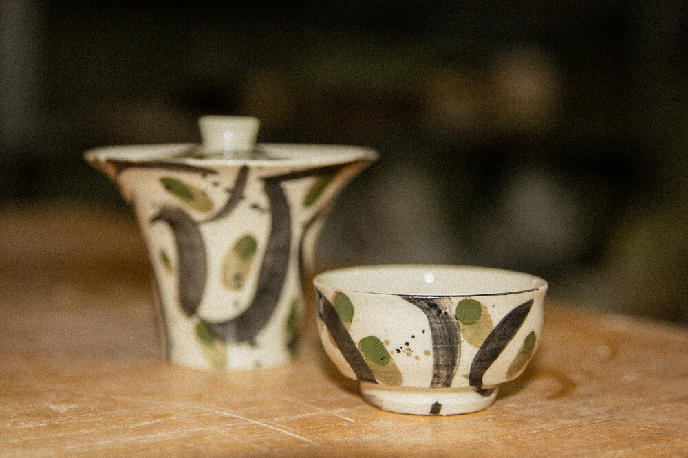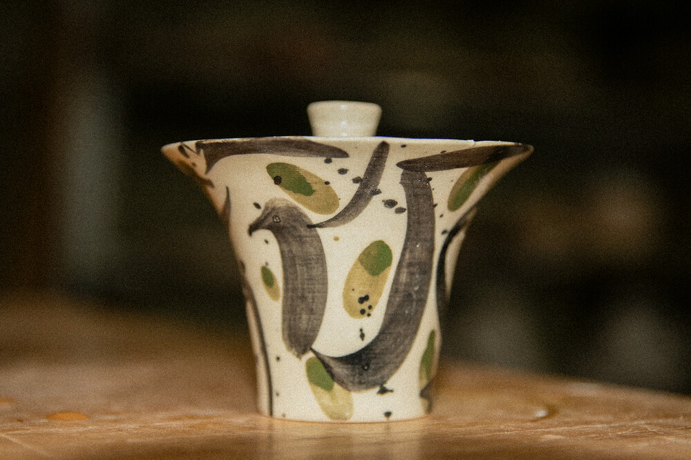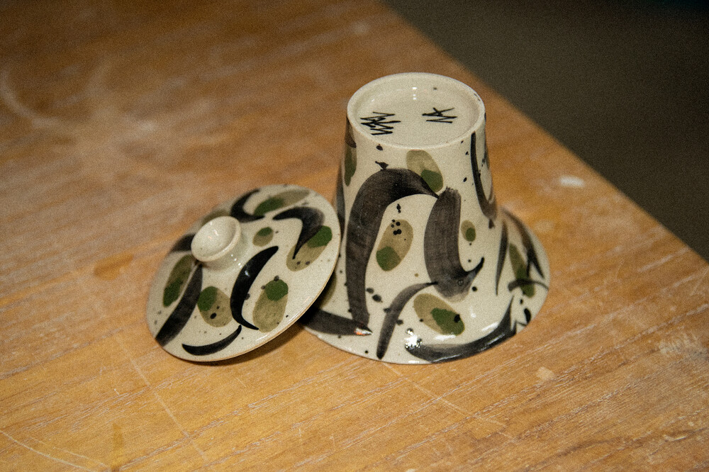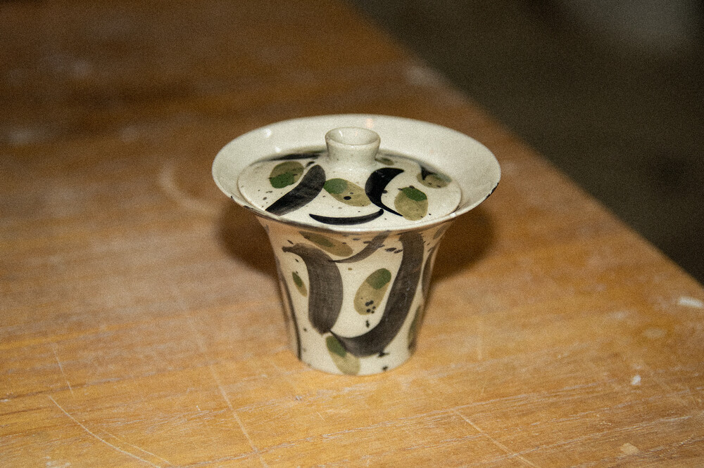 「노전요」 최성훈 작가님의 백자 베이스 개완이에요. 상하좌우 밸런스감이 좋고 날렵한 디자인의 기물이에요. 쭉 뻗은 붓질과 초록색 터치의 조화는 찻자리의 분위기를 한껏 높여줘요. 당당하게 쭉 뻗은 나무처럼 찻상을 든든하게.